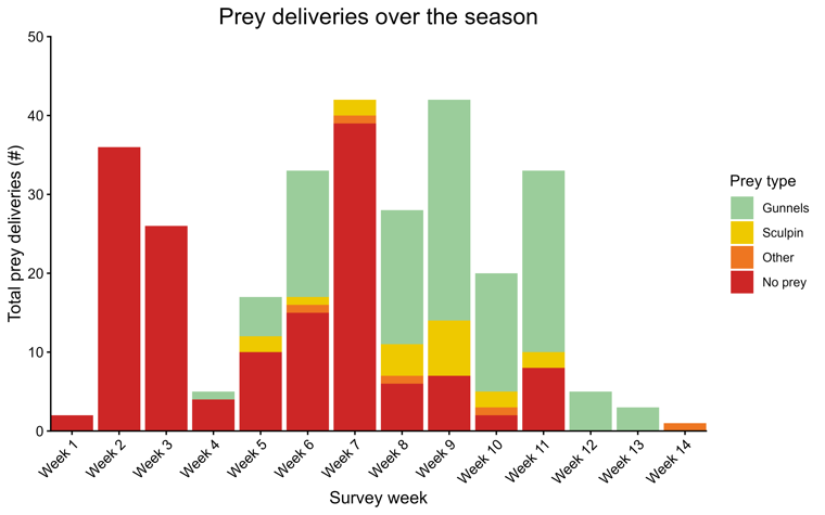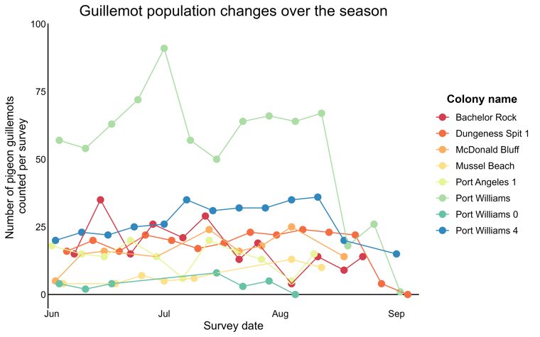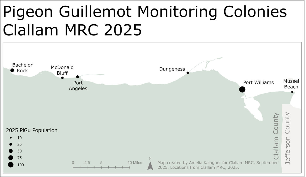 In 2016, the pigeon guillemot survey project was initiated in collaboration with Island MRC and Olympic Peninsula Audubon Society. Surveys take place weekly from June through September. Volunteers, dressed in neutral colors, sit quietly for one hour each week at an assigned beach location. The surveyor records the time and number of PIGU, burrow visits, type of fish carried to the burrows, and any disturbances observed from raptors, walkers and boats. The number of survey sites each year depends on the number of volunteer surveyors. The survey data are entered into a regional database, and results made available for the public.